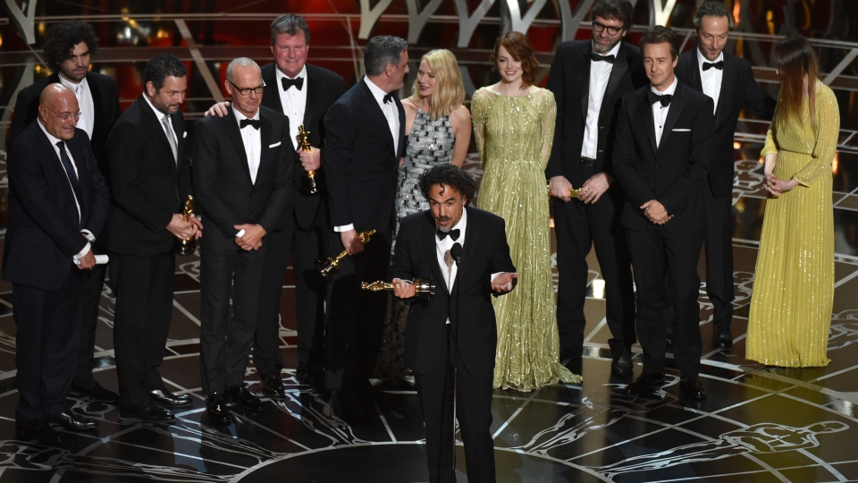 The cast and crew of Birdman arrive on stage to celebrate its Best Picture victory