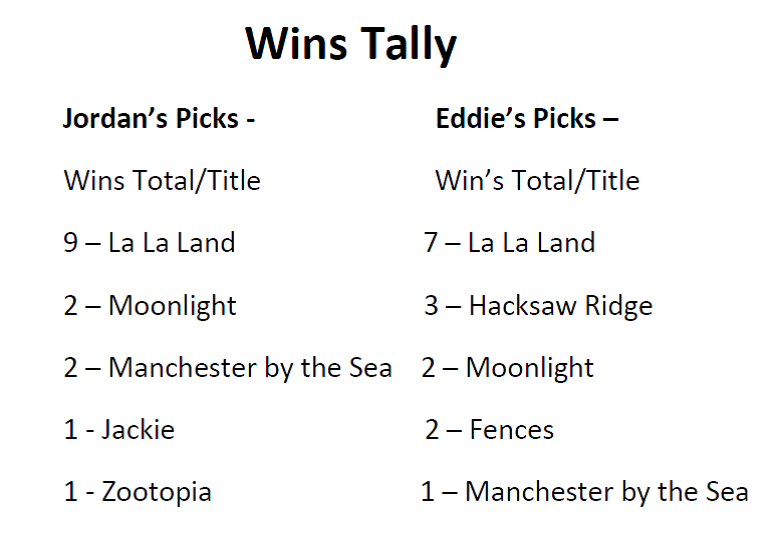 In regards to getting the tally’s right this year, both Jordan and Eddie weren’t too far off the mark with La La Land in particular winning far less than many had first thought.